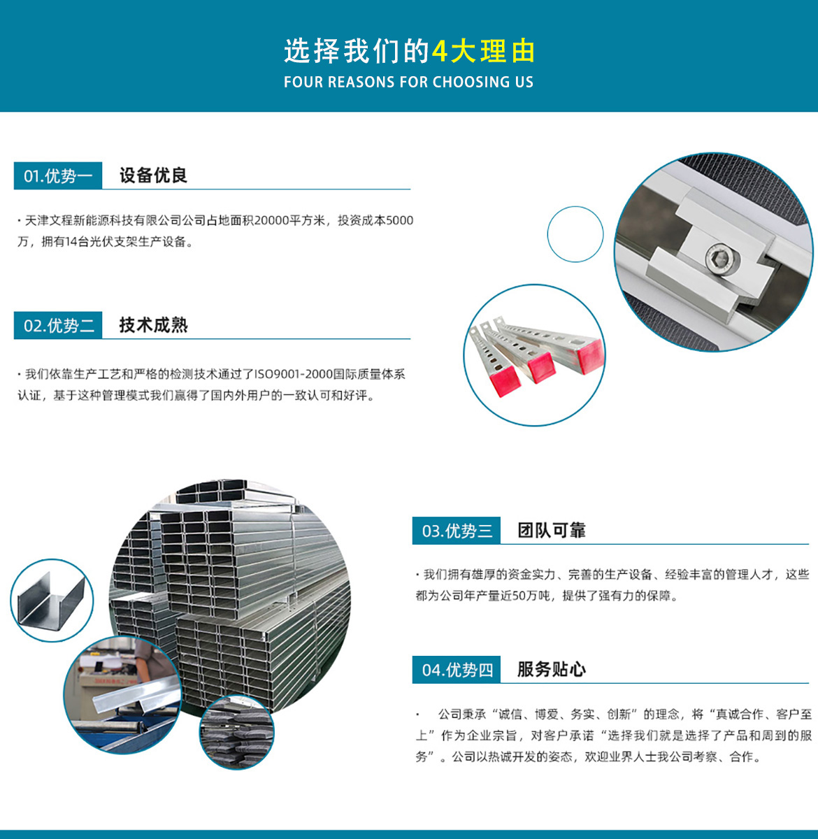 天津文程新能源科技有限公司成立于2021年,是專注于集中式、分布式、漁光互補和農光互補等清潔能源發(fā)電的綜合性企業(yè) 公司是集設計、研發(fā)、生產、制造為一體的綜合型企業(yè)。公司占地面積20000平方米,注冊資金5000萬元整。公司坐落于華北鋼鐵重鎮--大邱莊,距天津市區(qū)50公里、鄰104和205國道及京滬高速,交通十分便捷。 本公司擁有三個生產車間,其中兩個冷彎型鋼車間,一個鋅鋁鎂型鋼車間,擁有自動冷彎成型機10條,自動數控沖孔機10條以及焊接加工等設備。主要生產產品有:太陽能光伏支架、各種規(guī)格的C/Z/U型鋼、抗震支架、管廊支架及整套配件等。